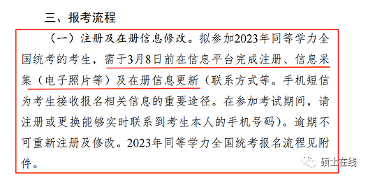 根據(jù)通知文件的要求,各位學(xué)員需要在3月8日前完成同等學(xué)力信息平臺注冊、資格審查等,若未按規(guī)定時間及要求完成相應(yīng)工作的不允許報考此次全國統(tǒng)考!