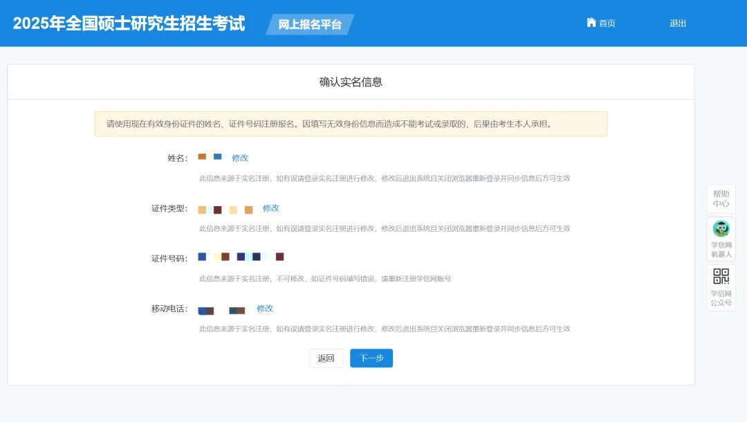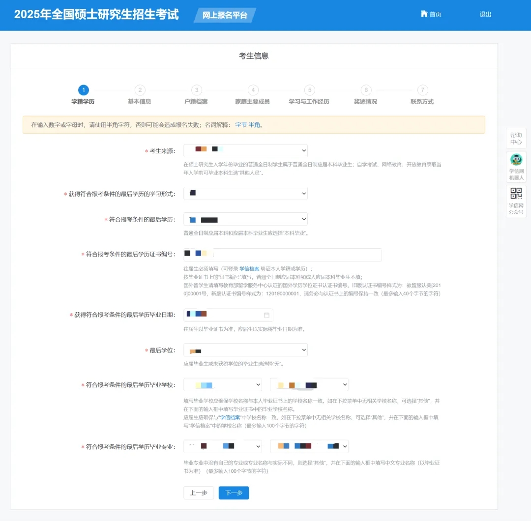 確認(rèn)實(shí)名注冊(cè)信息后,考生首先要按照《2025年全國(guó)碩士研究生招生工作管理規(guī)定》要求填寫正確的學(xué)歷(學(xué)籍)信息。