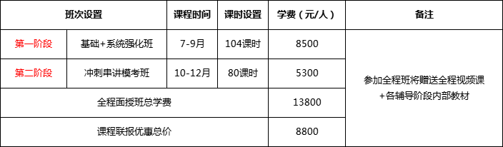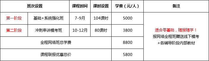 (一)面授班費(fèi)用 報(bào)全程面授班:基礎(chǔ)班+系統(tǒng)強(qiáng)化班+沖刺串講??及?13800元/生。 現(xiàn)報(bào)班享特大優(yōu)惠價(jià)8800元/人(贈(zèng)送價(jià)值5800元全程視頻課+各輔導(dǎo)階段內(nèi)部資料)。 (二)網(wǎng)絡(luò)班費(fèi)用 1、報(bào)全程網(wǎng)絡(luò)班:基礎(chǔ)班+系統(tǒng)強(qiáng)化班+精講模串班=8800元。 現(xiàn)報(bào)班享受特大優(yōu)惠價(jià)5800元/人。 2、報(bào)網(wǎng)絡(luò)班送:贈(zèng)送???各輔導(dǎo)階段內(nèi)部資料。 3、網(wǎng)絡(luò)視頻課針對沒有時(shí)間參加面授班學(xué)員,手機(jī)、電腦下載APP可自由安排時(shí)間學(xué)習(xí),費(fèi)用低,效率高。
