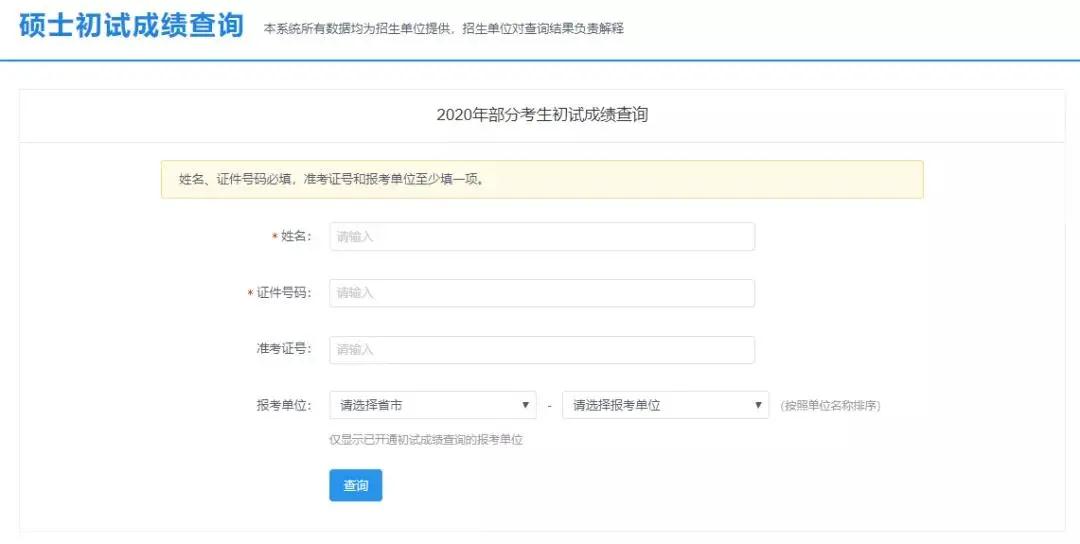 姓名、證件號(hào)碼必填,準(zhǔn)考證號(hào)和報(bào)考單位至少填一項(xiàng),所以,準(zhǔn)考證丟失的考生也不必?fù)?dān)心,到時(shí)候也可以查到初試的分?jǐn)?shù)。