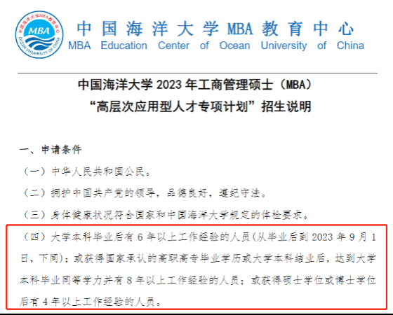 值得注意的是,部分招生單位對(duì)于學(xué)歷要求有不同的調(diào)整。如下圖所示,中國海洋大學(xué)2023年MBA“高層次應(yīng)用型人才專項(xiàng)計(jì)劃”有更長的工作年限要求。